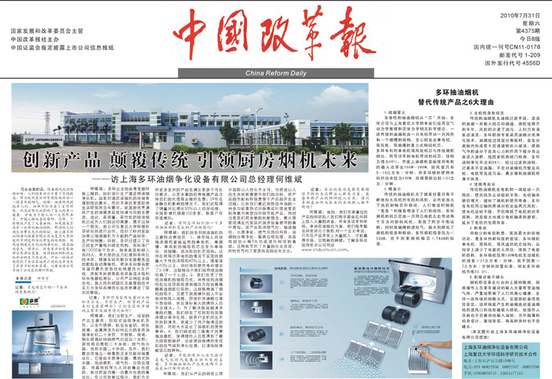 《中國改革報》:大家都知道,廚房油煙是造成室內環境污染的主要原因,而且極易危害家人的身體健康,因此大家對抽油煙機的產品性能非常關注,接下來請何總詳細介紹一下多環抽油煙機突出的產品性能吧!
